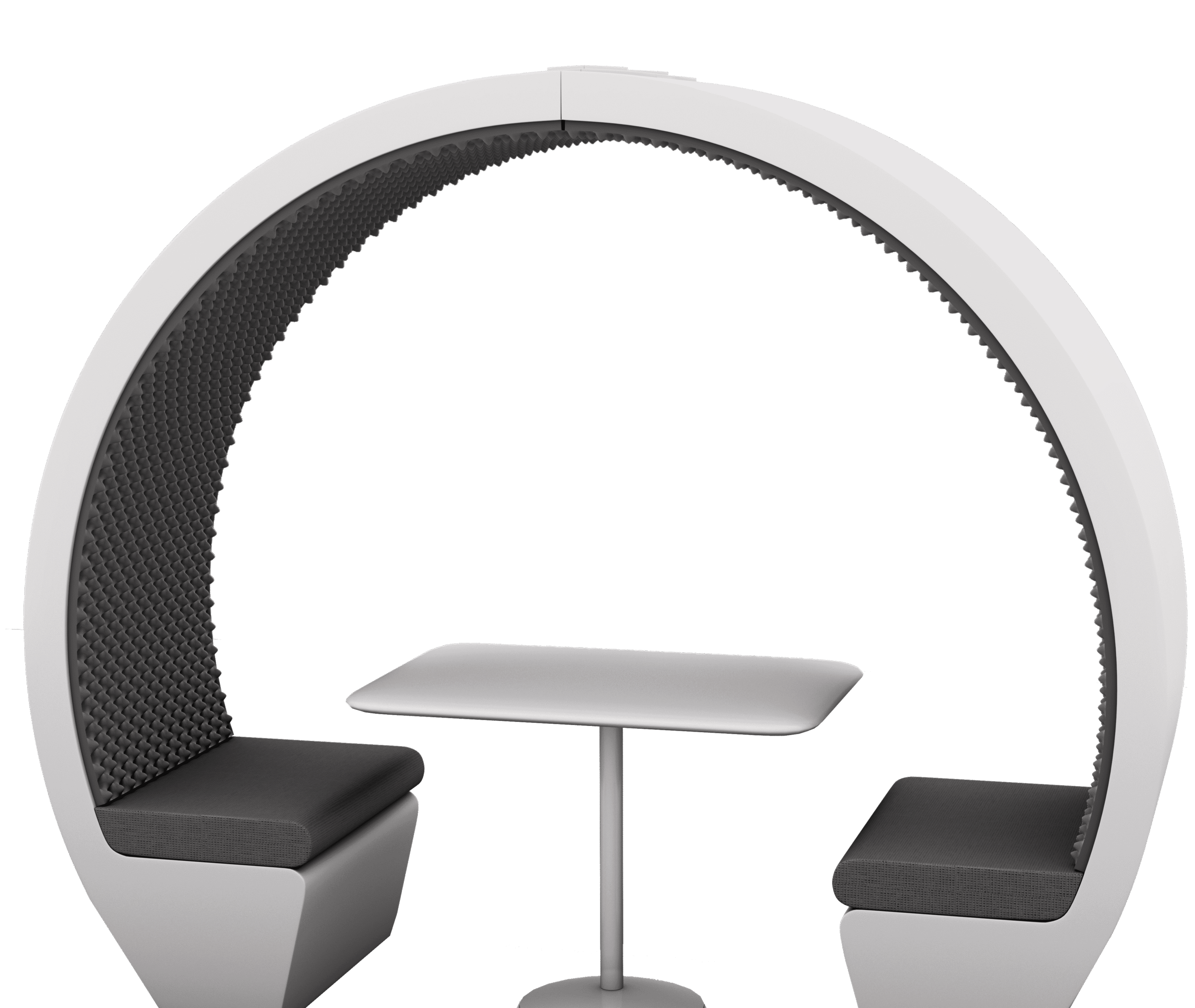 Circular Open Pod is composed of a shell in the form of a loop, made of composite materials from recycled plastic bottles, though it is finished in a neutral white as a standard, there is an option to have it in other colours for a stronger design statement. This open meeting pod has its front and back fully open to allow for ease of access, the internal walls and ceiling of the Circular Open Pod are covered in an egg crate patterned acoustic foam. The internal walls and ceiling of the Circular Open Pod are covered in an egg crate patterned acoustic foam that further adds to the pod’s privacy by aiding sound absorption and noise reverberation.