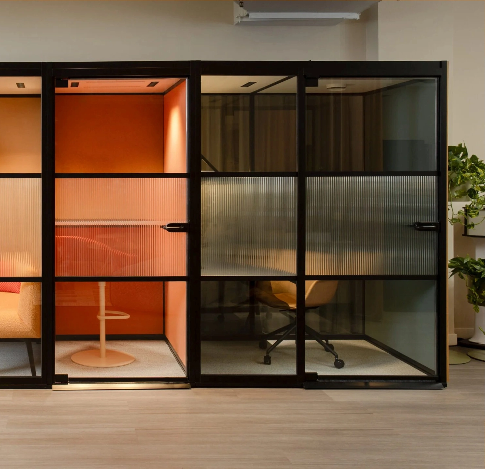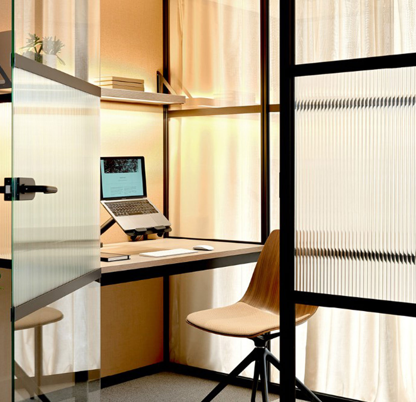 The Mews Focus Brief provides a sound-insulated, distraction-free environment with acoustic fabric walls and acoustic upholstered ceiling tiles that reduce noise pollution, ensuring private and uninterrupted work. The toughened glass door and panel offer a sleek, modern aesthetic while maintaining a sense of openness.