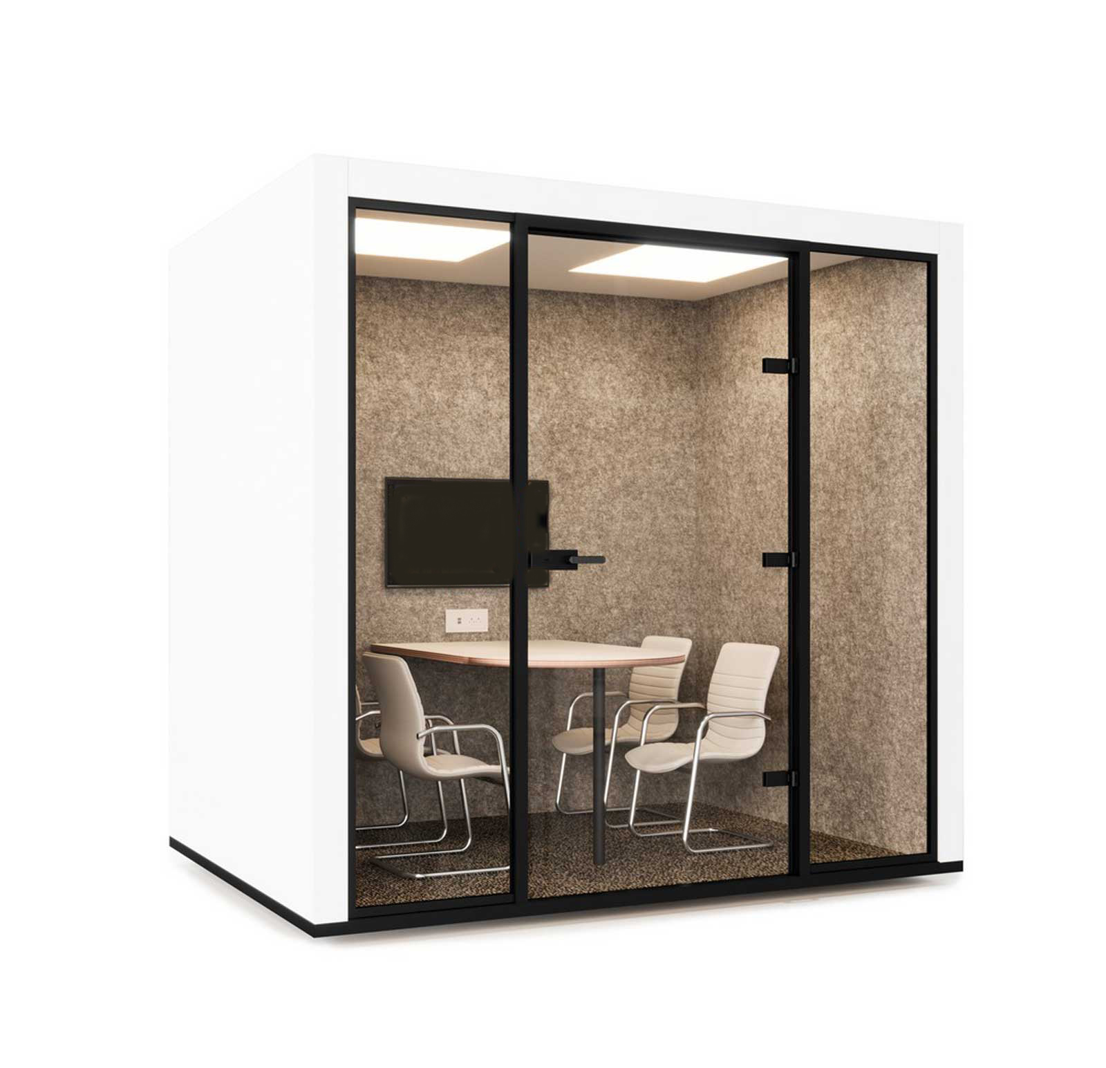 Material finishes include a choice of white or black exteriors, silver acoustic felt for effective sound insulation, and a dark grey carpet to reduce noise transmission and enhance comfort. These refined finishes complement contemporary interiors and create a professional appearance.