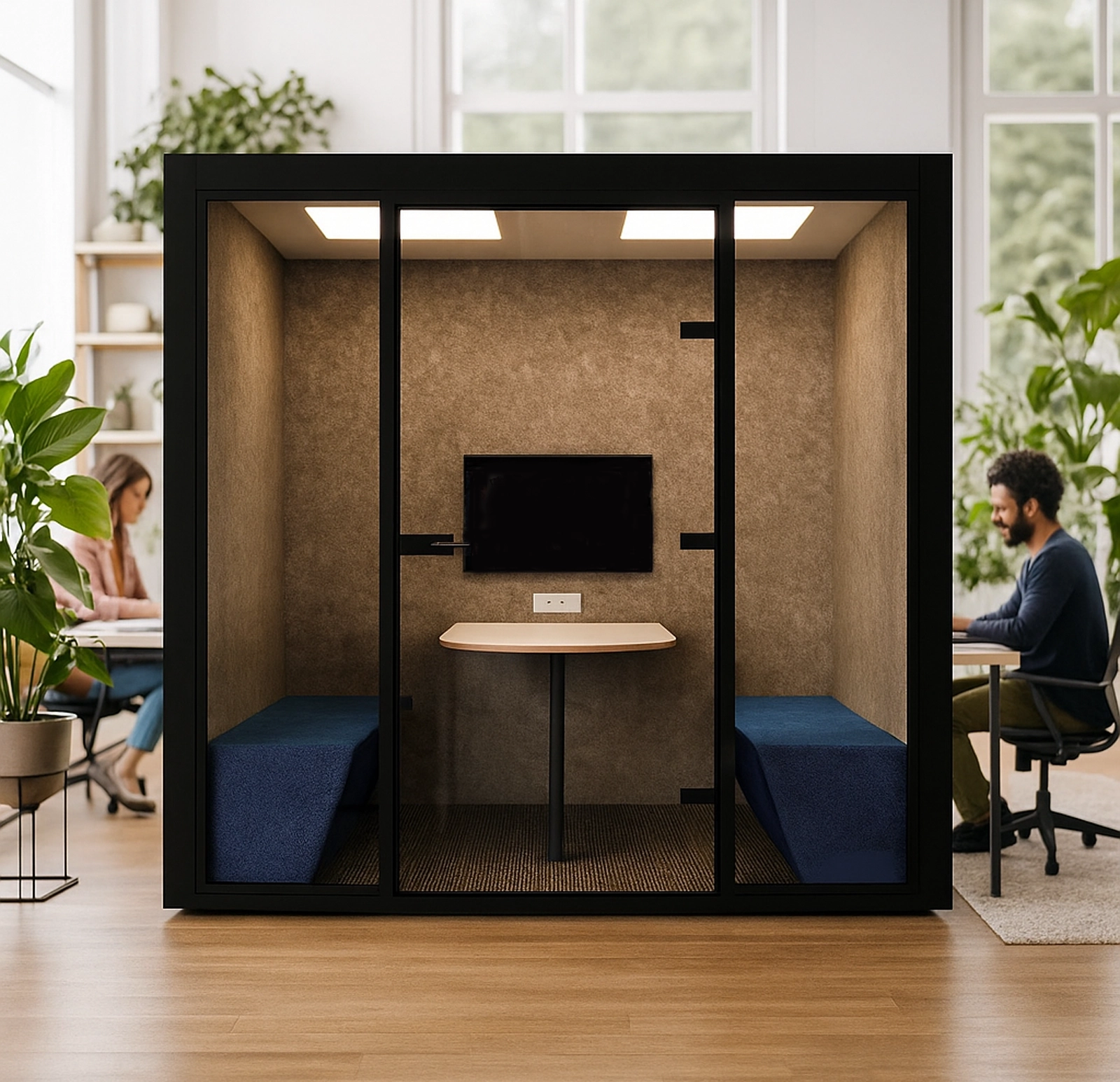 The pod’s acoustic performance (30 dB noise reduction) ensures privacy and minimises external interruptions, ideal for focused discussions or video conferencing.