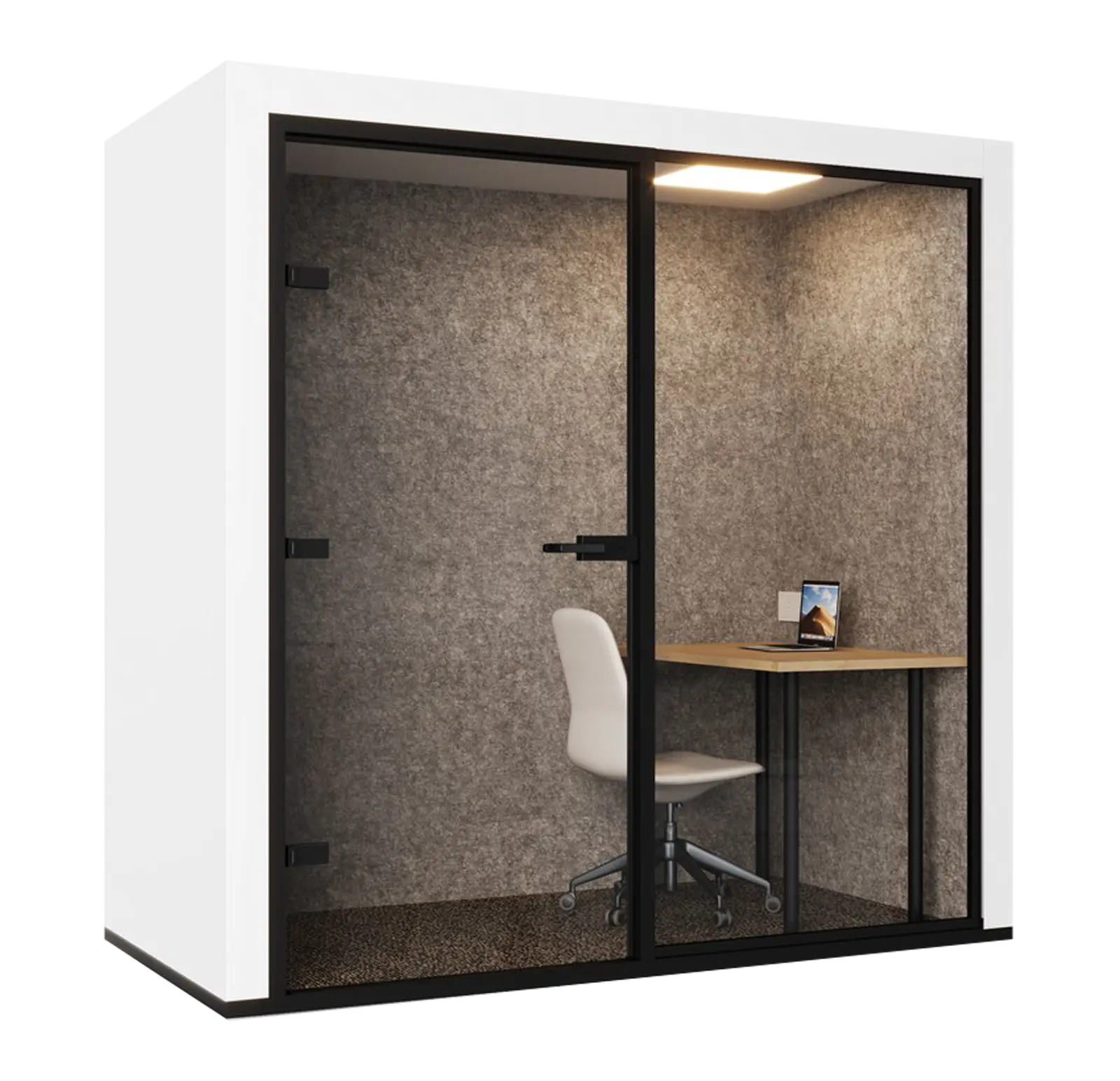 The restrained styling suits most schemes and supports quick, intuitive use—step in, close the door and get to work. With single‑occupancy layout and a tidy work surface, the work pod lends itself to short focus sessions, confidential calls or uninterrupted video meetings.
