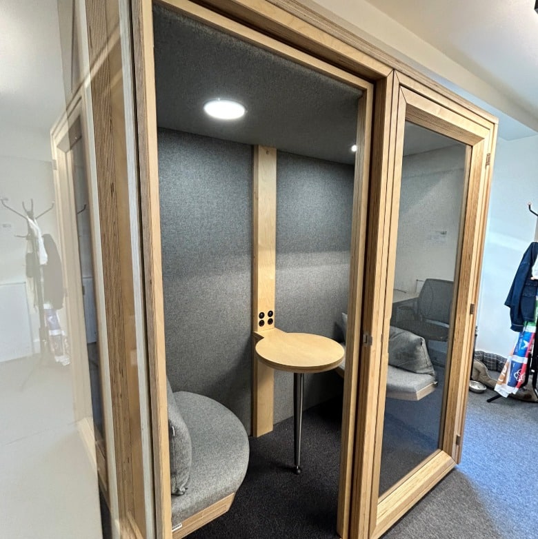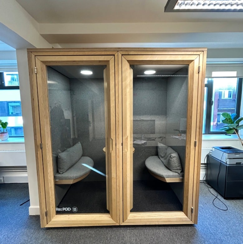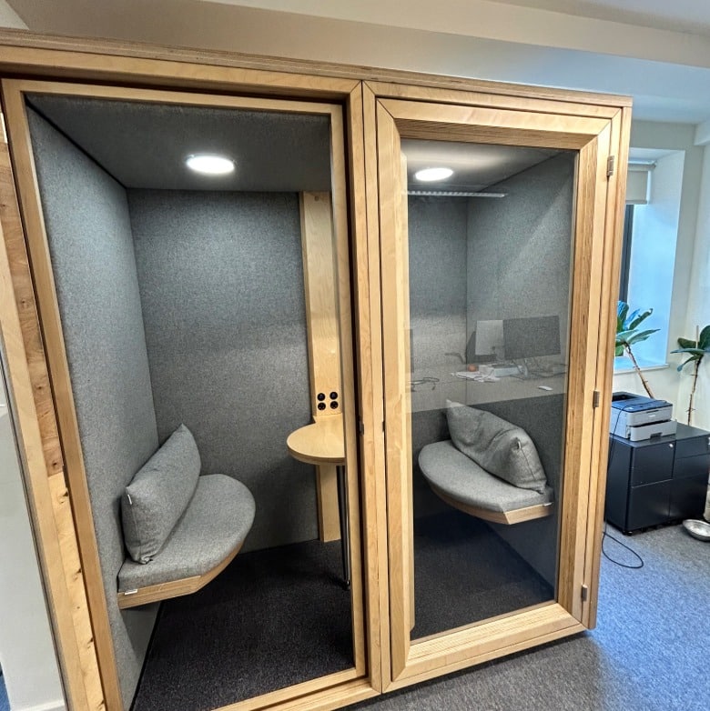 Constructed with a durable plywood shell, glazed front and soft seal door, it opens into a private yet bright interior with grey felt walls. Inside, users benefit from integrated twin bench seating with cushions, a central table, LED lighting, ventilation, plus power and USB connectivity for a comfortable and functional workspace.